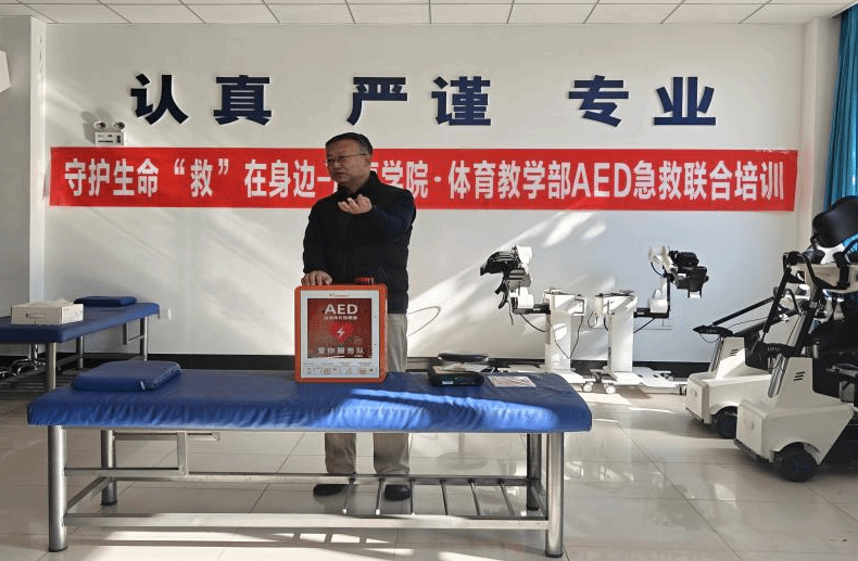 10月17日,公益组织“爱你服务队”向康复学院捐赠了2台AED急救设备。并将两台设备部署在康复实训中心大厅门口和学校文体馆东门门口处。为了发挥急救设备的最大效能,提升师生应急救护能力,10月23日,康复学院与体育教学部在康复学院实训中心联合开展“守护生命,‘救’在身边”AED(自动体外除颤仪)急救培训。邀请临床实践教学中心主任张汝峰教授担任主讲,康复学院院长高松、体育教学部主任石磊以及部门全体教师共同参加了培训。