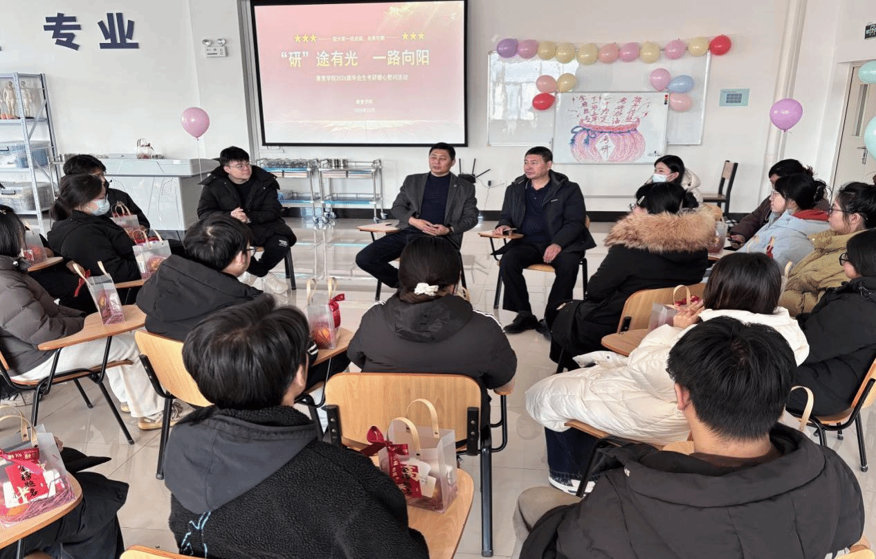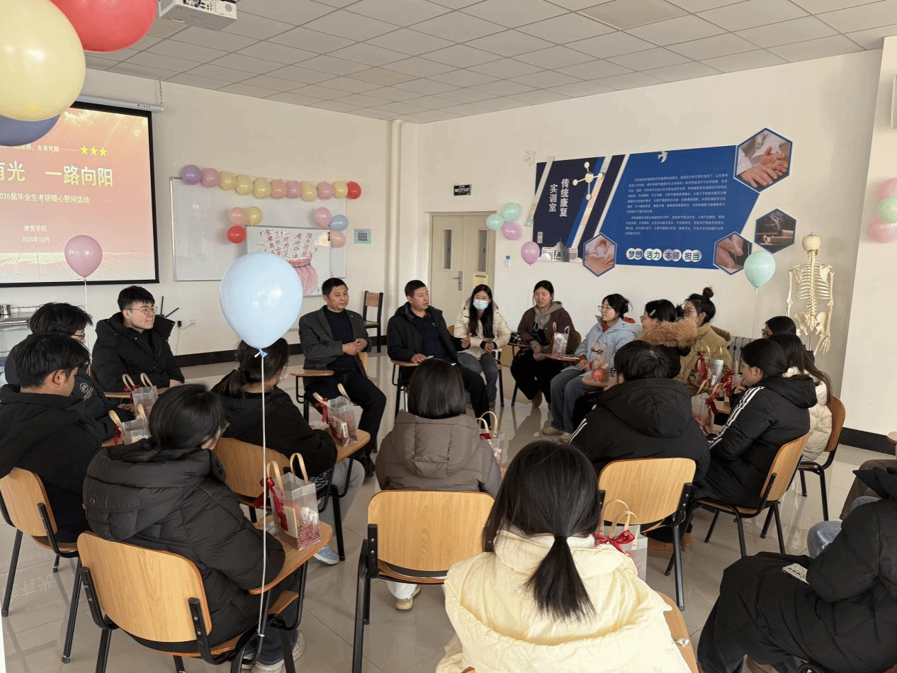 冬意渐浓,温情愈暖。2025年12月17日,康复学院举办“‘研’途有光,一路向阳”考研暖心慰问活动。学院院长高松、党总支书记周东升及全体辅导员参与本次活动,与2026届考研学生展开面对面交流,将学院的关怀与期许化作冬日里的暖阳,照亮学生逐梦前行的道路。
